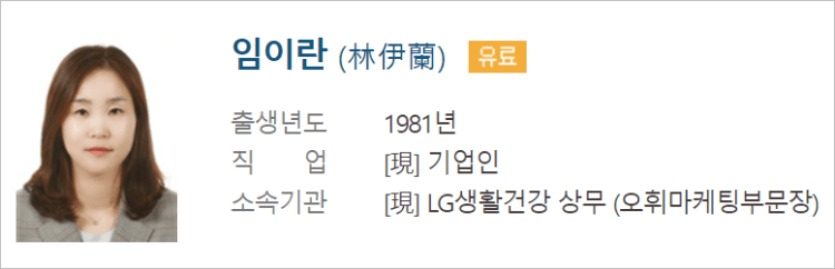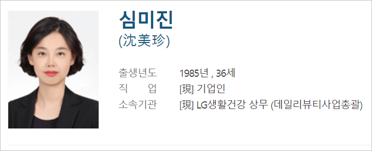 알려진 기업 정보란에 올라온 정보상으로는 1985년생으로 36세 최연소 상무로 임원을 달았던 것으로 알려지는 인정받은 LG 임원으로 여자 임원으로 30대로 2명이 임명이 되었는데 심미진 상무가 35세이고 생활용품의 헤어 바디케어 마케팅을 담당하고 있는 심미진 상무(나이는 1985년생) 그리고 또 다른 한 명은 오휘 화장품 마케팅을 담당하고 있는 임이란 상무(1981년생)로 lg를 이끌어갈 차세대 여성 임원으로 확인이 되어서 신세대로 이제 사업역량을 강화하는 방향으로 보입니다.